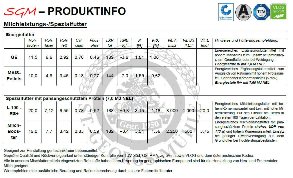 Unser umfangreiches Standardfuttersortiment mit Energiestufe IV (7,0 MJ NEL) für die Nutzung bei stark grasbetontem Grundfutter mit fixen Anteilen an Körnermais und Sojaextraktionsschroten bei den Hoch-Proteinfuttern erfüllt alle Ansprüche eines gesunden Futters und ist komplett für die Erzeugung gentechnikfreier Lebensmittel geeignet:
